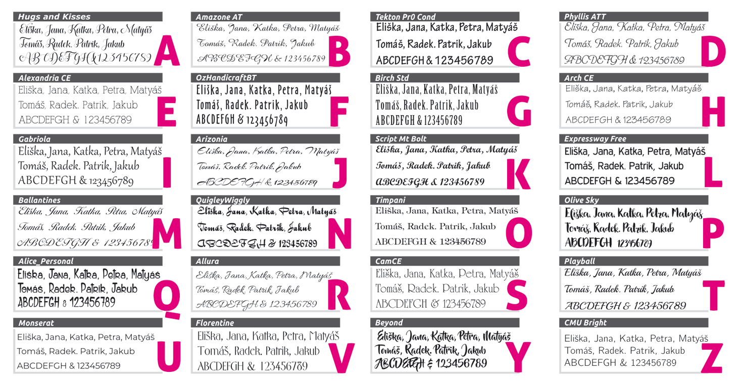 Vyberte si požadovaný rozměr obrazu, font nabízeného písma dle přiloženého vzoru a vložte do košíku. Do poznámky napište jména nevěsty a ženicha, datum svatby a popřípadě místo svatby. V případě dalších úprav nás kontaktujte na mail: studio@eskap.cz